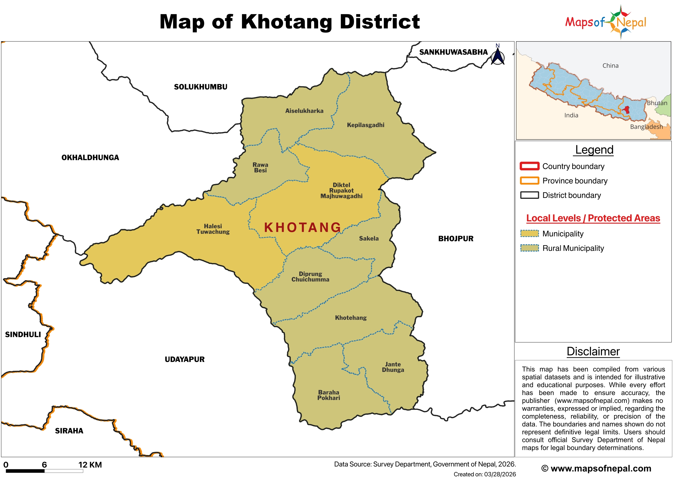 Khotang District (Nepali: खोटाङ जिल्ला) is one of 14 districts of Province No. 1 of eastern Nepal. The district, with Diktel as its district headquarters, covers an area of 1,591 km2 (614 sq mi) and has a population (2021) of 206,312. The district has been bordered by Bhojpur District in the east, Udayapur district in the south, Okhaldhunga district in the west and Solukhumbu district in the North. In this district there are 2 municipalities and 8 rural/urban municipalities.